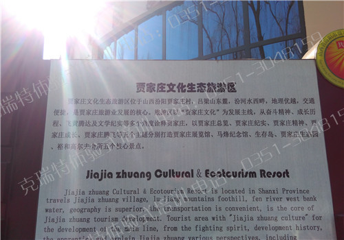 山西省汾阳市贾家庄生态园由贾家庄村自行设计、自筹资金、自行建造。是******首批农业旅游示范点.园内,依山市景,逢水筑廊;鸟语花香,曲径通幽,自然风光与人造景观相媲美。五谷争俏,六畜鸣春;垂钓划船,采摘野炊,观光农业与休闲恰情相融合。组培车间,试管操作;温室大棚,四季常青,科技示范与科研教学相结合。汾州文物,三晋特产;农家风味,乡村情趣,文化底蕴与风土人情相交汇。生态园,是你陶冶性情、回归自然的理想之所,是你开启心智、增长见识的天然课堂,是你合家旅游、享受生活的旅游胜地。